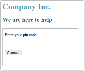 Nadat je deze voorbeeldcode in je website hebt ingevoegd, heb je het volgende deelnameformulier:<html> <head> <title>Bedrijf Inc.</title> </head> <body> <h1 style="color: #5E9CA0;">Company Inc.</h1> <h2 style="color: #2E6C80;">Wij zijn er om u te helpen</h2> <p>Voer uw Pincode in: </p> <form onsubmit="locatie.href='https://helpdesk.me/end-user-support/' + document.getElementById('supportSessionId').value; return false;"> <p><input id="supportSessionId" name="supportSessionId" pattern="\d*" type="text" maxlength="9"></p> <p><input type="submit" value="Connect"></p> </form> </body> </html>